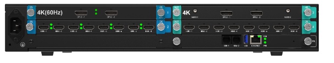 - LAN và RS232: Cung cấp giao thức giao tiếp mượt mà với các hệ thống điều khiển trung tâm (như Crestron, Extron, AMX), cho phép quản trị viên lập trình các kịch bản bật/tắt, thay đổi bố cục màn hình từ xa thông qua phần mềm hoặc màn hình cảm ứng.